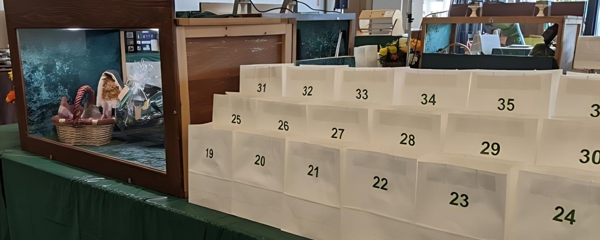 Prize SelectionParticipants get to choose which raffle prize they would like to win. Inside each display case, raffle prizes are numbered. There are bags with the corresponding number next to the display case.